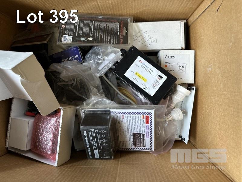 BOX ASST ACCESSORIES INC RF MODULATORS, 4-CHANNEL RUNNING LIGHT, AV SELECTOR, LED WALL DIMMER ETC