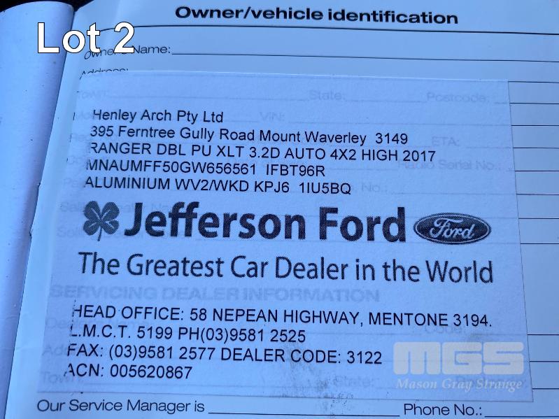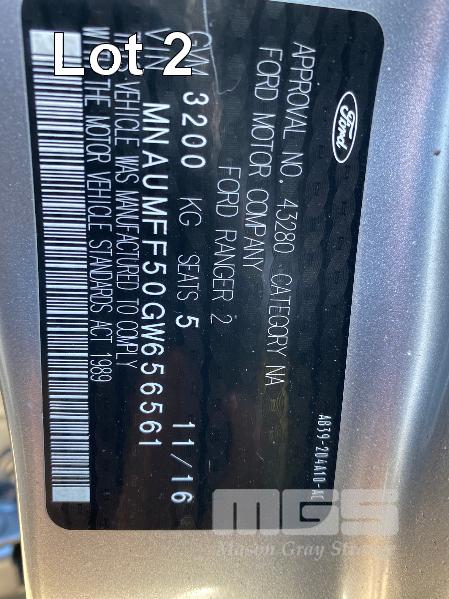 2016 FORD RANGER HIGH RIDER DUAL CAB UTILITY REG: NO PLATES VIN: MNAWMFF509W656561 ENG: PAT23395534 ODO: 300,816kms SHOWING 3.2 LITRE TURBO DIESEL, 6 SPEED AUTOMATIC TRANSMISSION, METALIC SILVER, 4 DOORS, 5 SEAT, ABS, AIR BAG, AIR CON, BLUETOOTH, CANOPY, CD PLAYER, CRUISE CONTROL, IMMOBILISER, LEATHER TRIM, POWER STEERING, POWER WINDOWS, ROOF RACKS, SAT NAV, SIDE STEP, TOW BAR, REVERSE CAMERA FITTED WITH CARRY BOY FIBREGLASS CANOPY KEY #5 (WITH 2 KEY/S, WITH OWNER'S MANUAL, WITH SERVICE BOOKS) CONDITION: LHS REAR DOOR & GUARD - SCRAPE/DENT