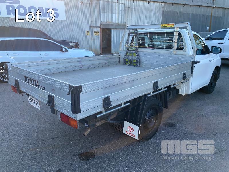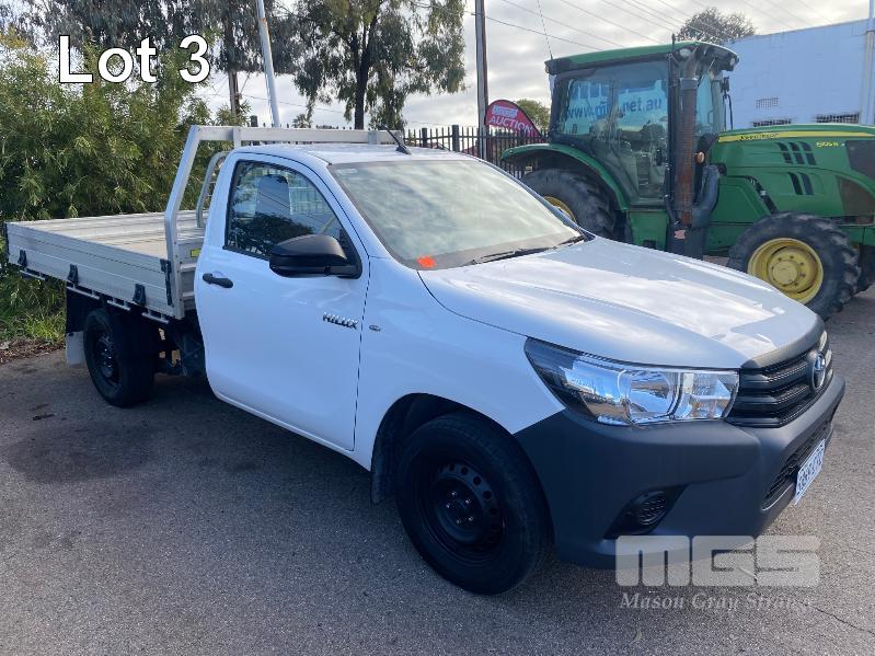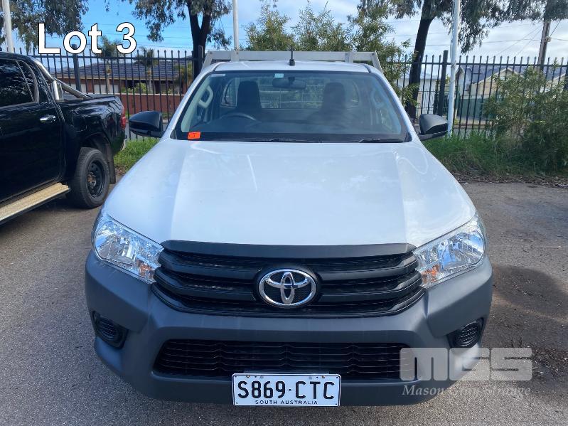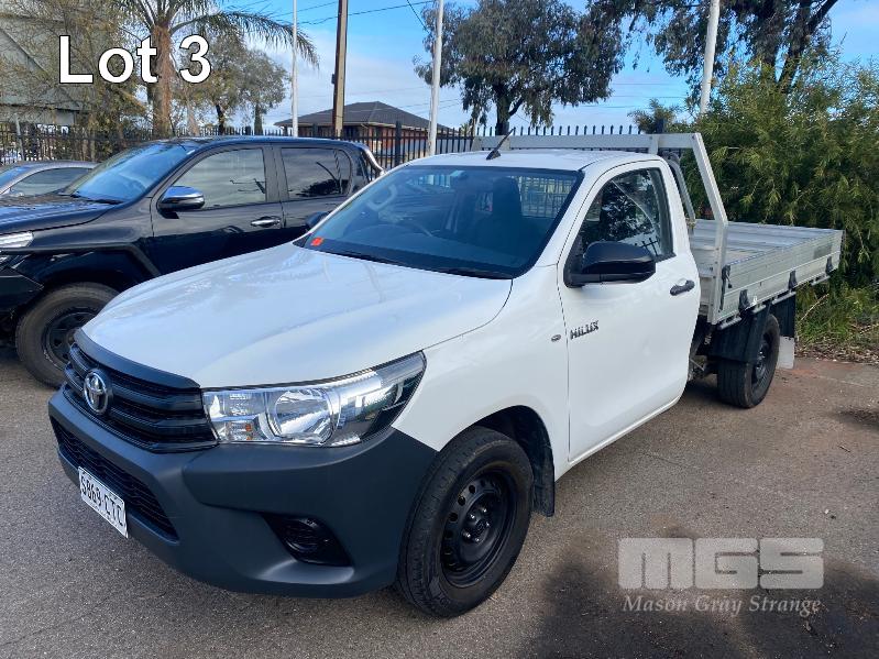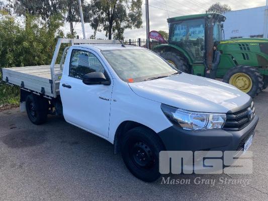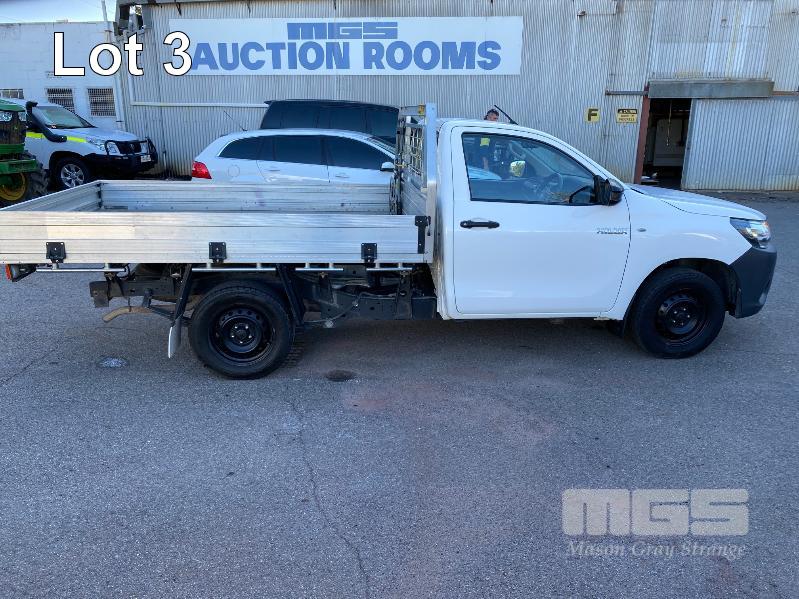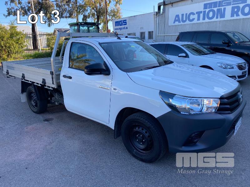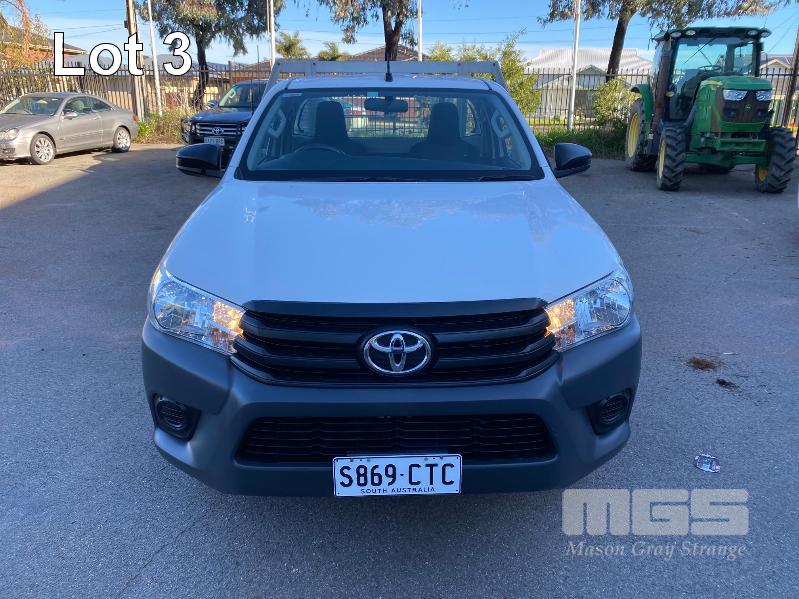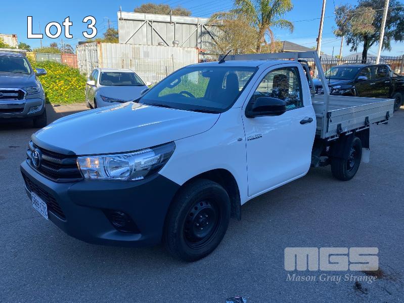 2016 TOYOTA HILUX 8 GEN SINGLE CAB TRAYTOP UTILITY REG: S869 CTC (SA) VIN: MR0EX3CBX01103342 ENG: 2TRA037466 ODO: 138,543kms SHOWING 2.7 LITRE PETROL, 6 SPEED AUTOMATIC TRANSMISSION, WHITE DUCO, 2 DOORS, 2 SEAT, ABS, AIR BAG, AIR CON, ALLOY TRAY, BLUETOOTH, CD PLAYER, CENTRAL LOCKING, CRUISE CONTROL, IMMOBILISER, POWER STEERING, POWER WINDOWS, SPARE WHEEL, TOW BAR, KEY #7 (WITH PAPERS, WITH 1 KEY/S)
