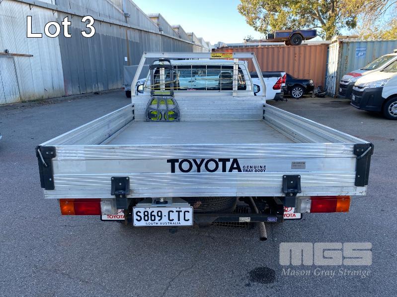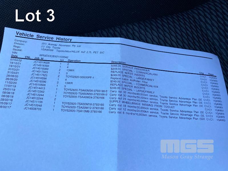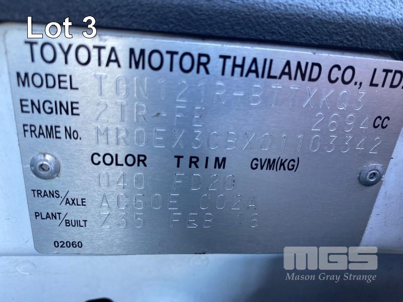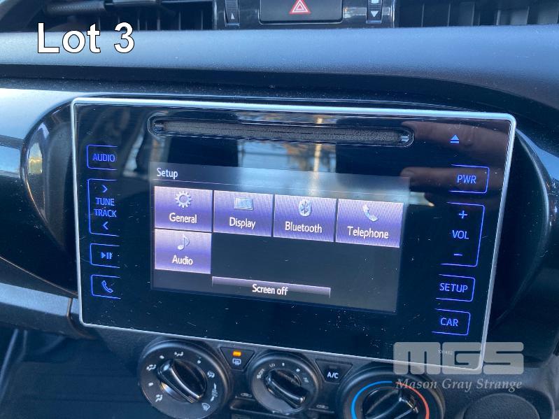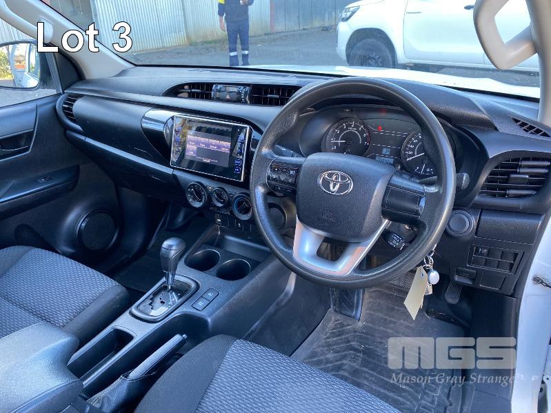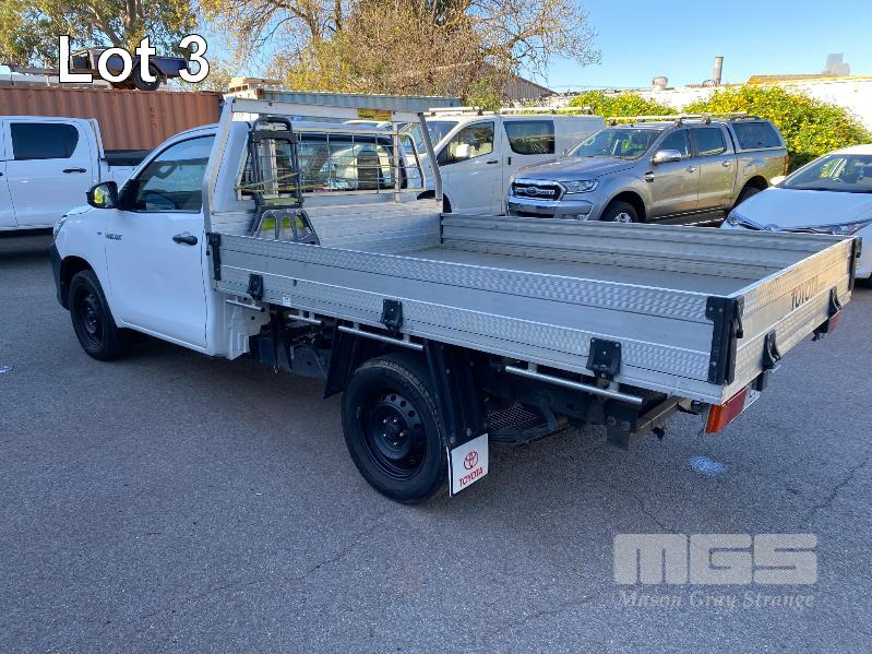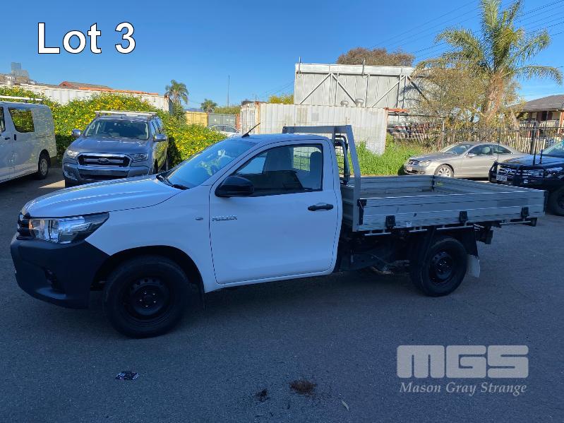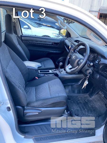 2016 TOYOTA HILUX 8 GEN SINGLE CAB TRAYTOP UTILITY REG: S869 CTC (SA) VIN: MR0EX3CBX01103342 ENG: 2TRA037466 ODO: 138,543kms SHOWING 2.7 LITRE PETROL, 6 SPEED AUTOMATIC TRANSMISSION, WHITE DUCO, 2 DOORS, 2 SEAT, ABS, AIR BAG, AIR CON, ALLOY TRAY, BLUETOOTH, CD PLAYER, CENTRAL LOCKING, CRUISE CONTROL, IMMOBILISER, POWER STEERING, POWER WINDOWS, SPARE WHEEL, TOW BAR, KEY #7 (WITH PAPERS, WITH 1 KEY/S)