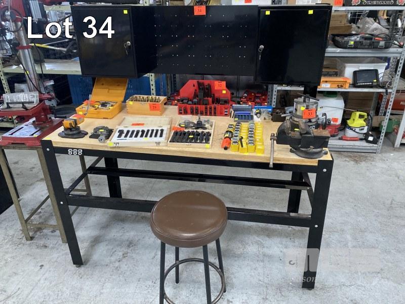 METAL WORK BENCH WITH 2 x STORAGE CABINETS, TIMBER TOP