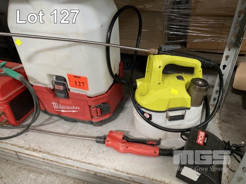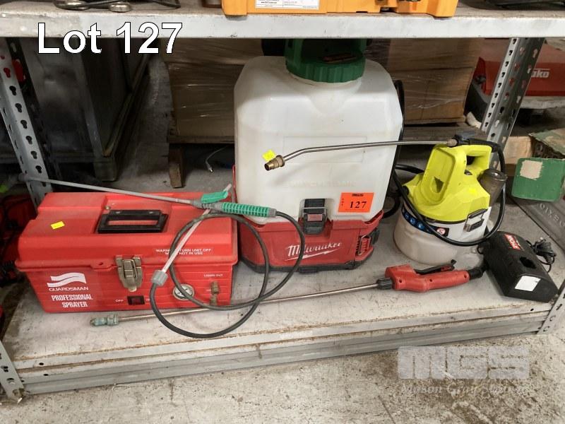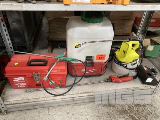 MILWAUKEE 18V BACKPACK SPRAYER, RYOBI 18V SPRAYER & CHARGER & GUARDSMAN 240V SPRAYER