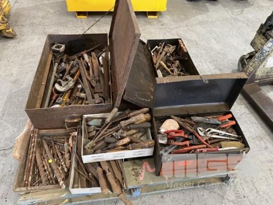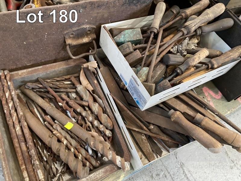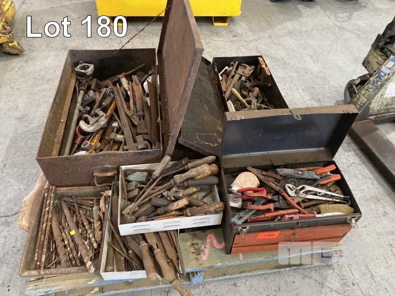LARGE QUANTITY ASSORTED HAND TOOLS, LEAD SOLDER TOOLS, DRILL BITS, FILES, WRENCHES, CUTTERS, CHISELS, ETC