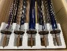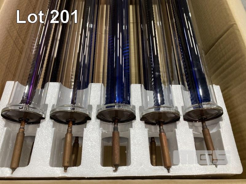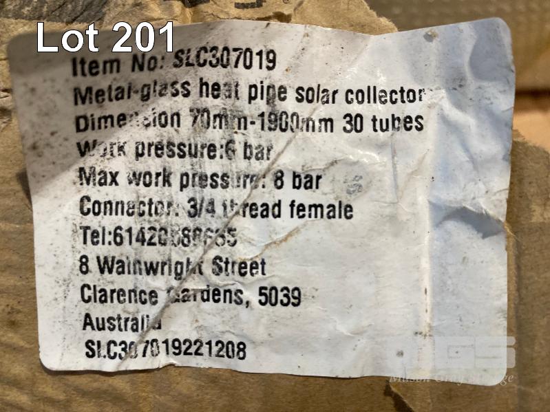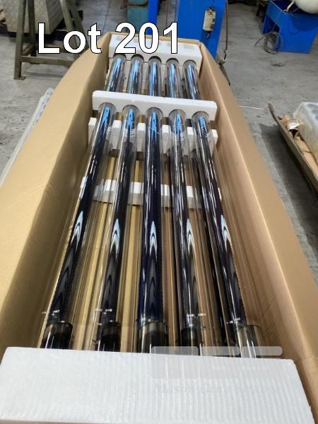 SOLAR ARRAY WATER HEATING TUBES & MANIFOLD 2 x MANIFOLD/FRAME 6 x BOXES OF SOLAR TUBES, 10 PER BOX TUBES ARE VACUUM SEALED, HEAT INTENSIFIES INSIDE TUBE TO TRANSFER HEAT TO COPPER END TIP, THE END TIP FITS INTO MANIFOLD TO TRANSFER HEAT INTO WATER IN THE MANIFOLD.