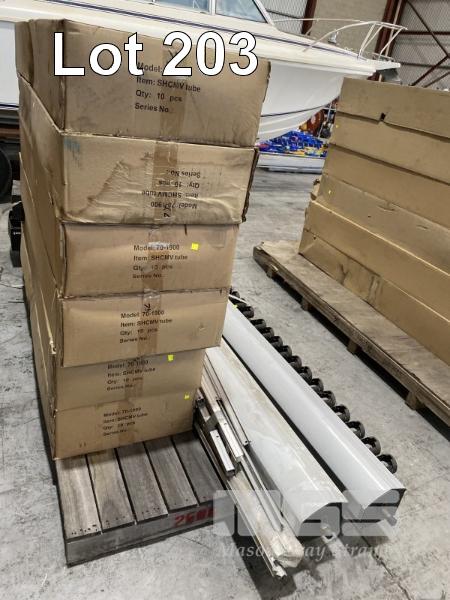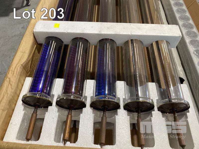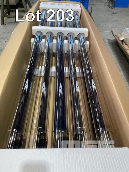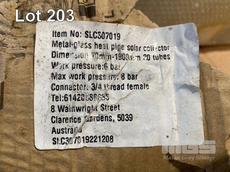 SOLAR ARRAY WATER HEATING TUBES & MANIFOLD 2 x MANIFOLD/FRAME (NOT IN BOXES) 6 x BOXES OF SOLAR TUBES, 10 PER BOX TUBES ARE VACUUM SEALED, HEAT INTENSIFIES INSIDE TUBE TO TRANSFER HEAT TO COPPER END TIP, THE END TIP FITS INTO MANIFOLD TO TRANSFER HEAT INTO WATER IN THE MANIFOLD. OPENED BOXES