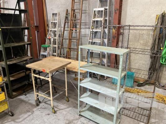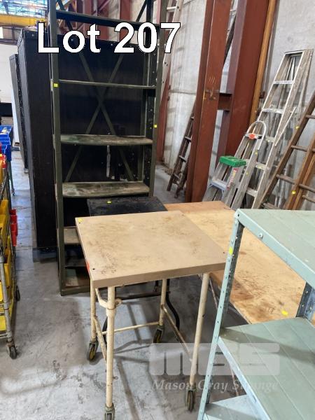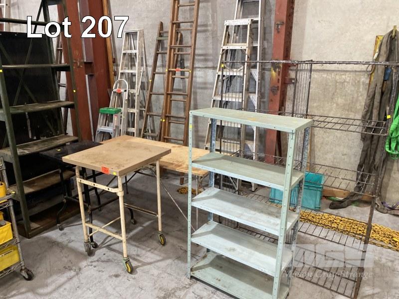 3 x SHELF UNITS, STEEL, MOBILE, WORKSHOP STANDS & TABLE, ASSORTED SIZES