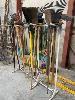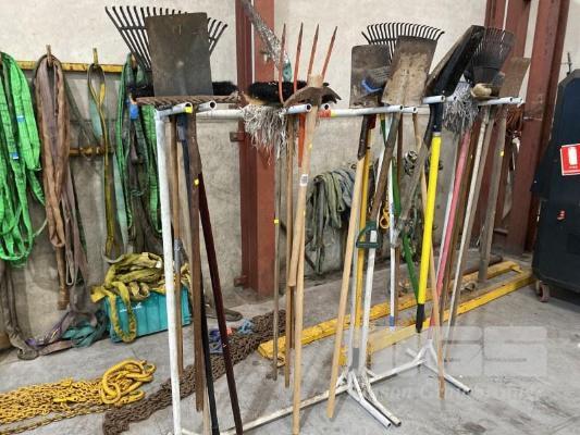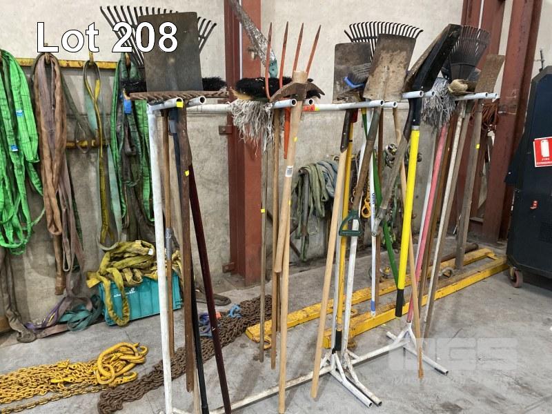 GARDEN TOOL RACKS, TUBULAR STEEL,1670 & 1700 (H) x 1000 & 600mm (W) & CONTENTS SHOVELS, PITCH FORKS, RAKES, PICK AXE, BROOMS, ETC