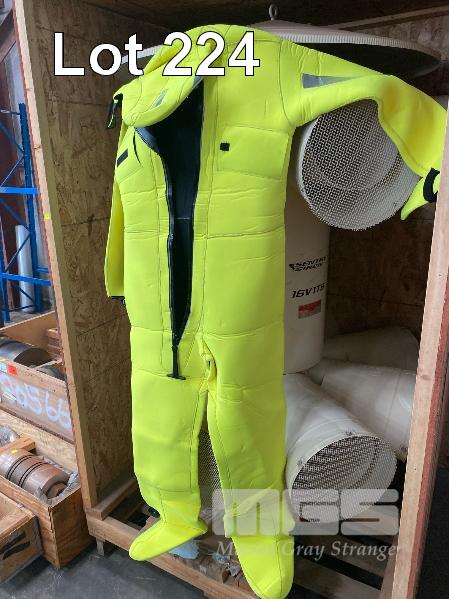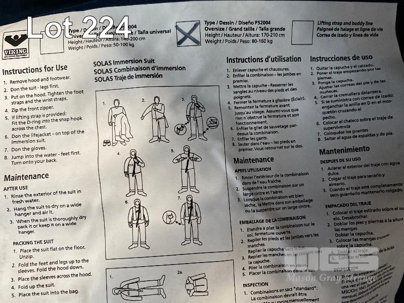 4 x VIKING SOLAS IMMERSION SUITS MOD: PS2004 DOM: 2016 SIZE: UNIVERSAL HEIGHT: 170-210cm WEIGHT: 80-160kg HIGH VISIBILITY YELLOW REFLECTIVE TAPE FOR HIGH VISIBILITY IN THE DARK THERMAL PROTECTION IN COLD WINTER IN CARRY BAG