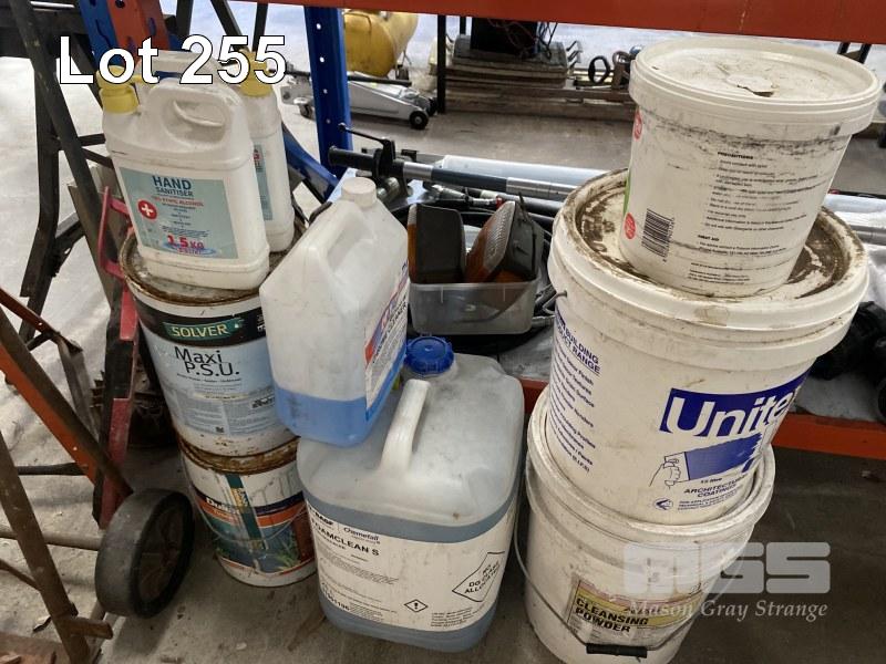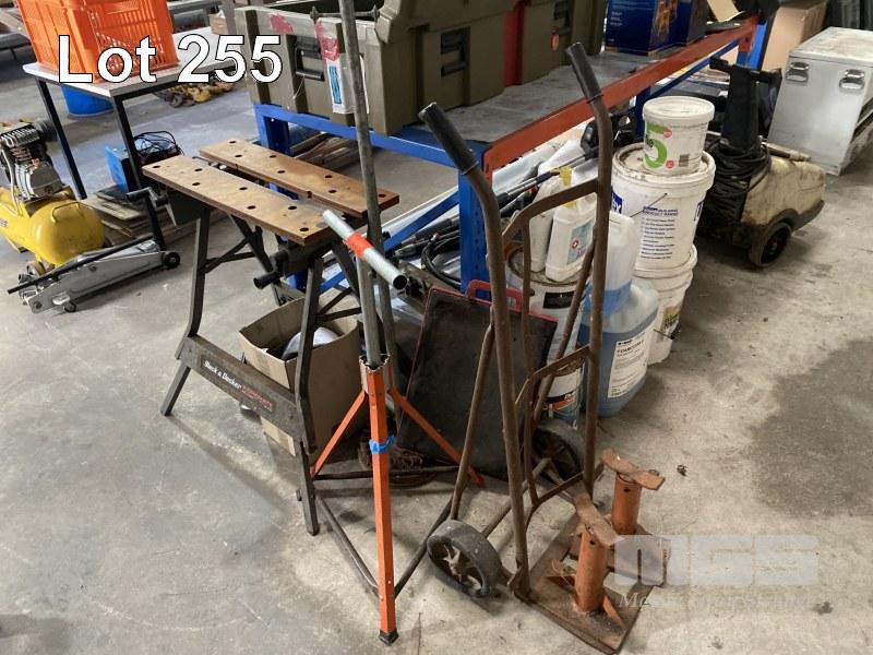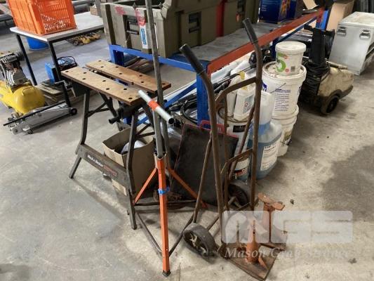 WORK MATE WORK BENCH, SACK TRUCK, TRIPOD STANDS, PAIR CHASSIS STANDS, UNITEN ARCHITECTURAL COATING 15LTR, PAINTS & CLEANERS, ETC