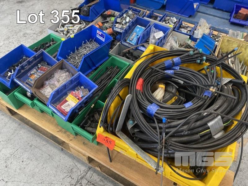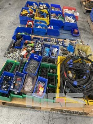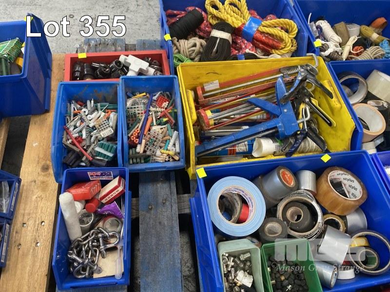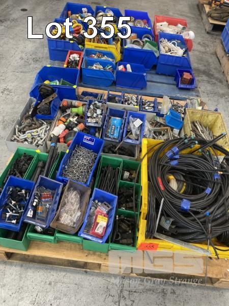 ASSORTED PARTS DRAWERS WITH ASSORTED D & BOW SHACKLES, CAULKING GUNS, IRRIGATION FITTINGS, TAPE, FASTENERS, ETC