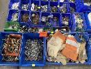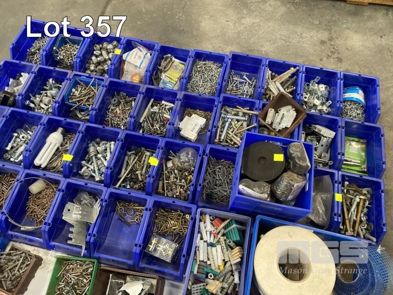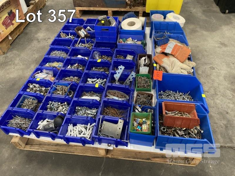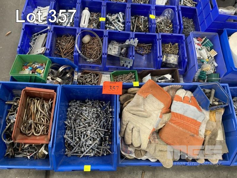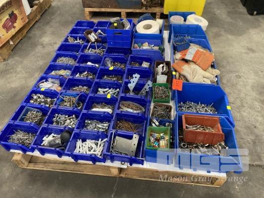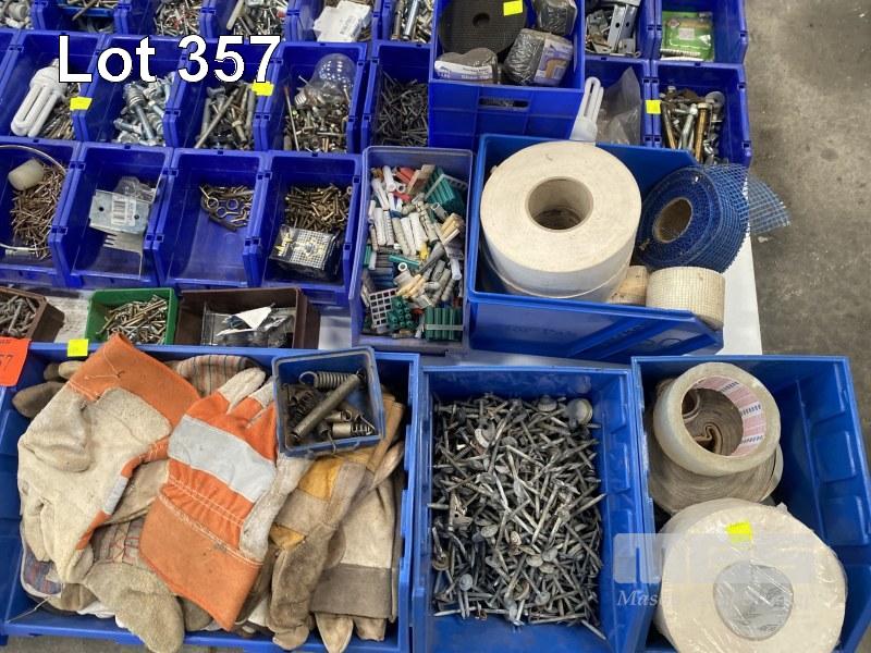 ASSORTED PARTS DRAWERS WITH LARGE QUANTITY MIXED SCREWS, NAILS, FASTENERS, BOLTS, TAPE, GLOVES, ETC