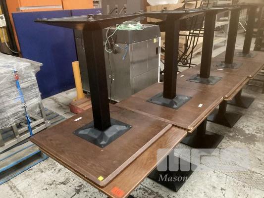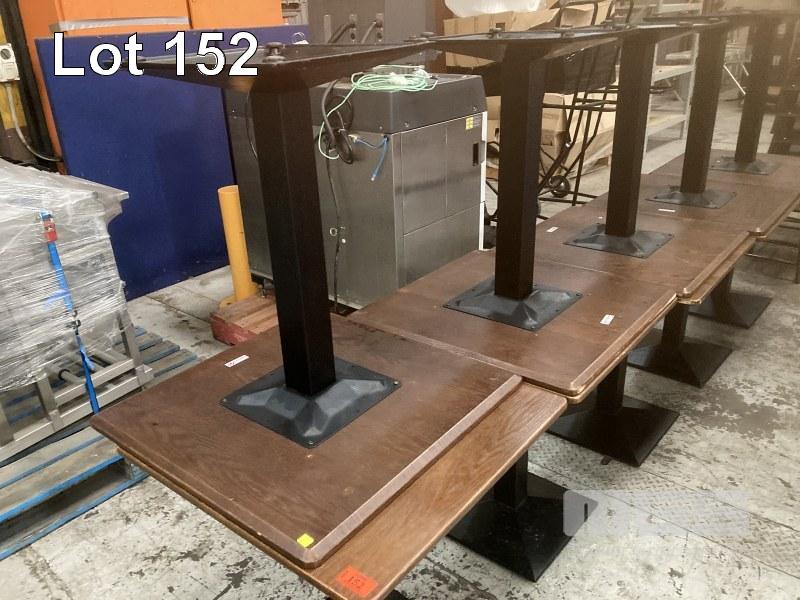 10 x CAFE TABLES, EACH 70 x 70cm, STAINED TIMBER TOP, PEDESTAL BASE