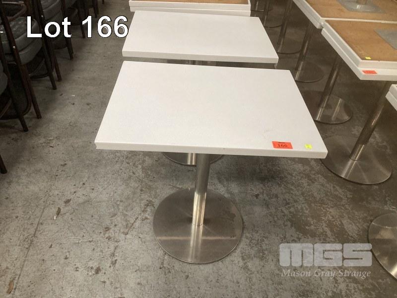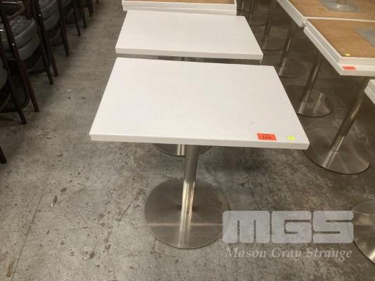 12 x CAFE TABLES, 700 x 520mm, WHITE ACRYLIC TOP, CHROME PEDESTAL BASE