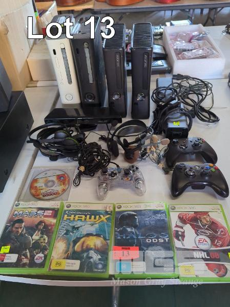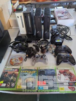 4 x XBOX 360 GAME COMPUTERS, ASSORTED GAMES, HAND CONTROLLERS, HEAD PHONES, ETC
