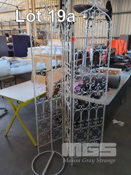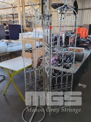 METAL LAMP STAND AND METAL FOLDING 3-PANEL ROOM DIVIDER IN WROUGHT IRON LOOK.