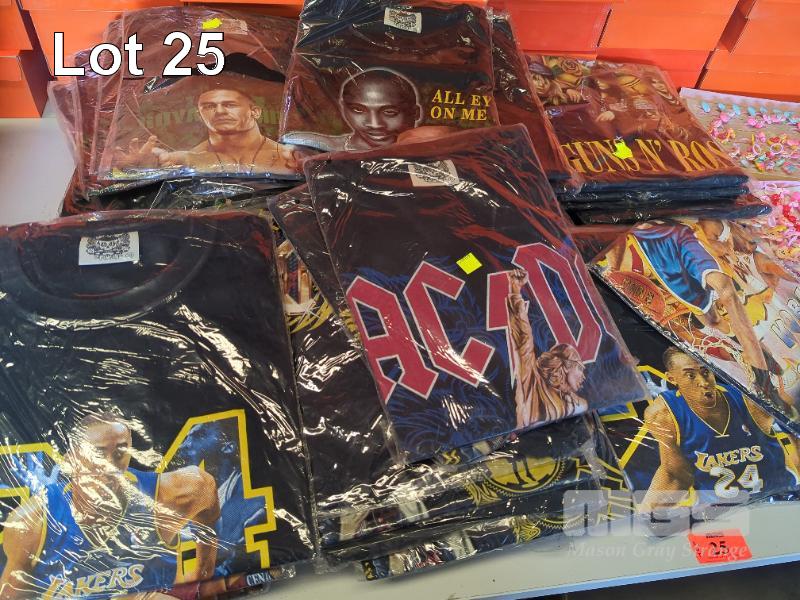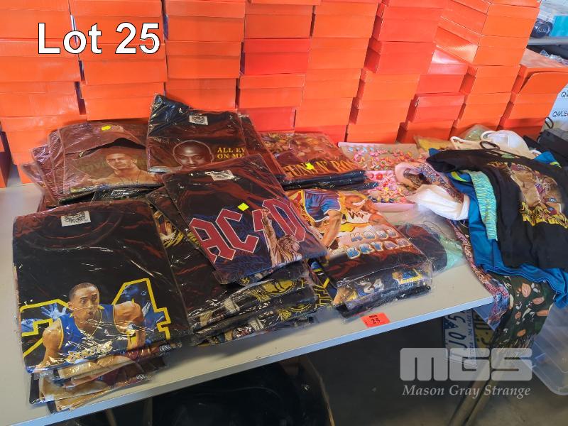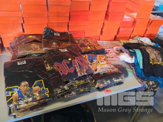 QUANTITY OF ASSORTED TRIBUTE T-SHIRTS, SCARVES, ACTIVEWEAR AND CHILDREN'S RINGS. INCLUDES KOBE BRYAN, GUNS & ROSES, 2 PAC, JOHN CENA, ACDC T-SHIRTS ETC.