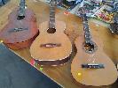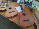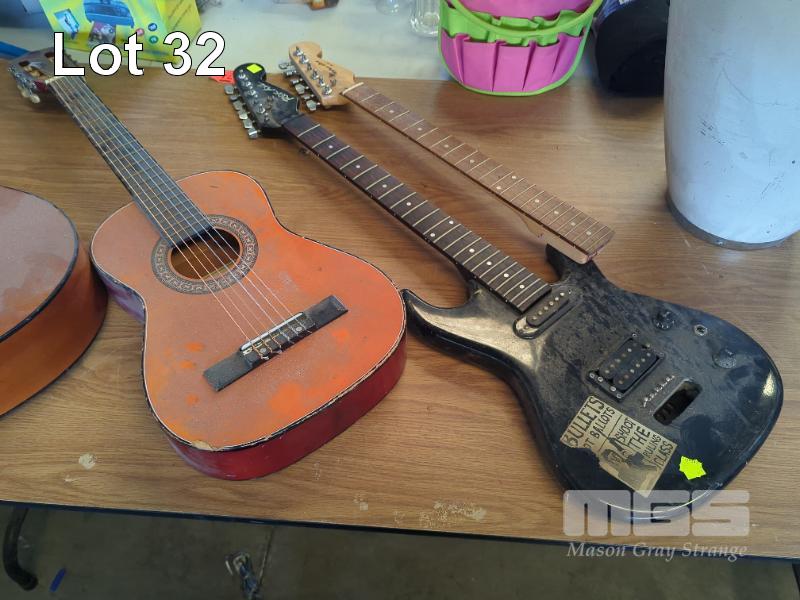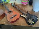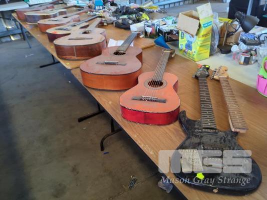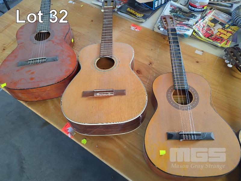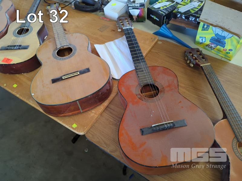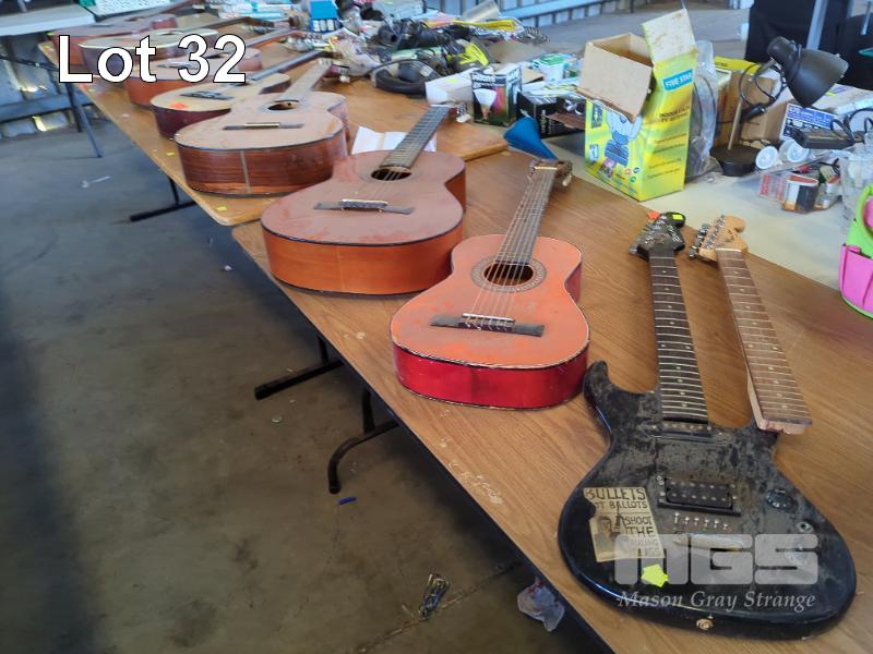 7 X ACOUSTIC GUITARS, 1 X ELECTRIC GUITAR, ELECTRIC GUITAR FINGERBOARD AND HEADSTOCK.
