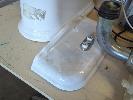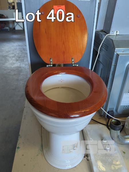 HERITAGE STYLE CERAMIC TOILET IN WHITE, WOODEN SEAT CHROME TRIM.