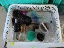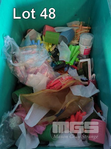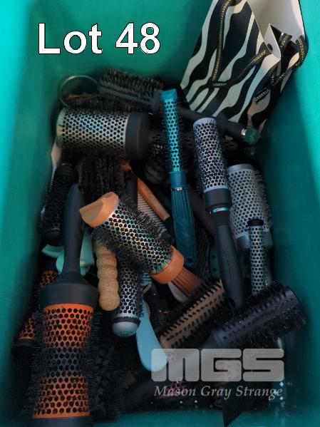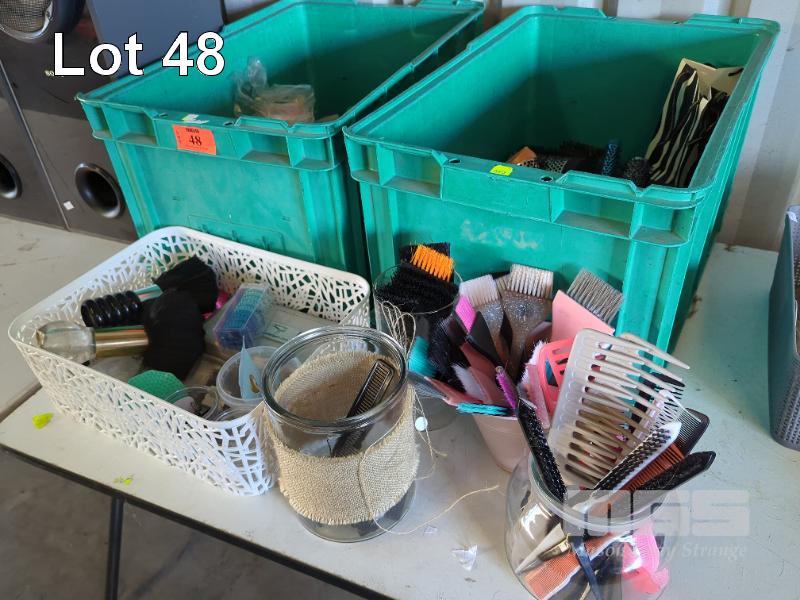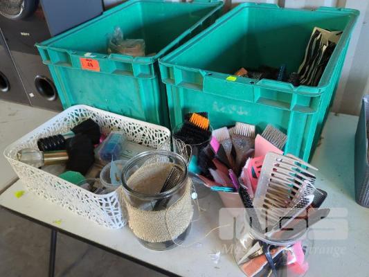 LARGE QUANTITY OF PROFESSIONAL HAIR SALON THERMAL BRUSHES, COMBS, SWISS ROLLERS, PERM ROLLERS, NECK DUSTERS, HAIR CLIPS, CAP, HAIR RINGS AND MORE. (2 X GREEN TUBS NOT INCLUDED)