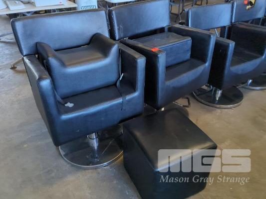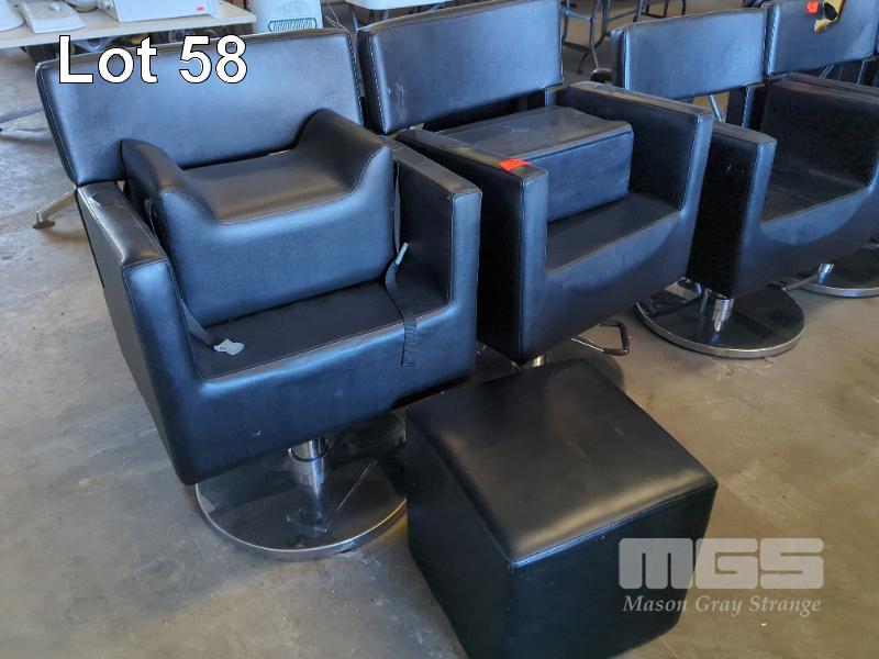 2 X ADJUSTABLE HEIGHT HAIR SALON SWIVEL CHAIRS WITH KIDS SEATS AND OTTOMAN.