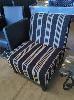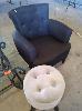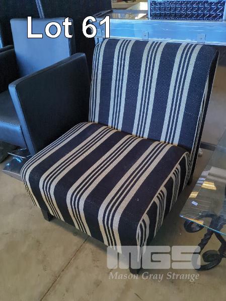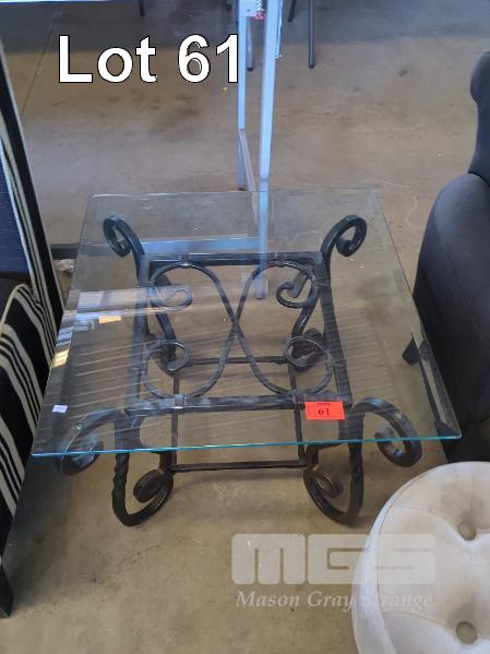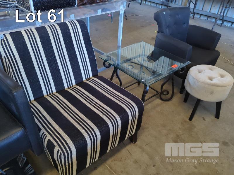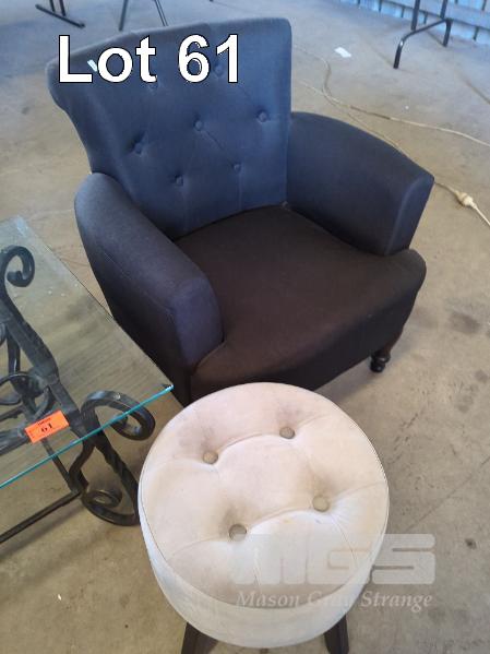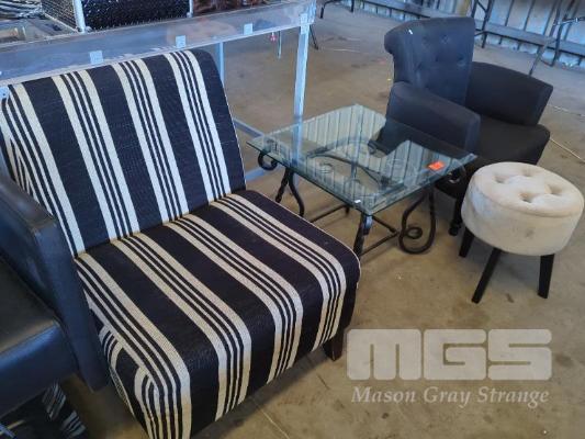 ASSORTED HAIR SALON FURNITURE. ARMLESS FABRIC CHAIR, GLASS TOP WROUGHT IRON MAGAZINE TABLE, FABRIC ARMCHAIR AND TUFTED BUTTON OTTOMAN.