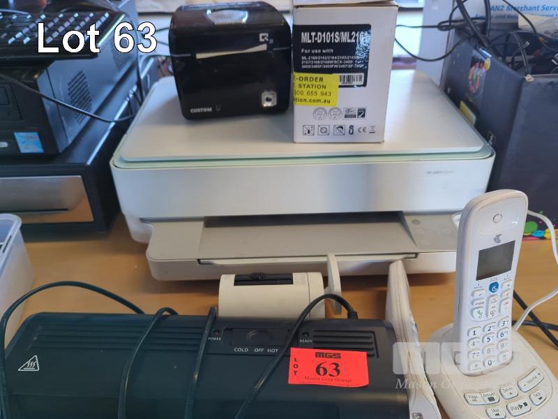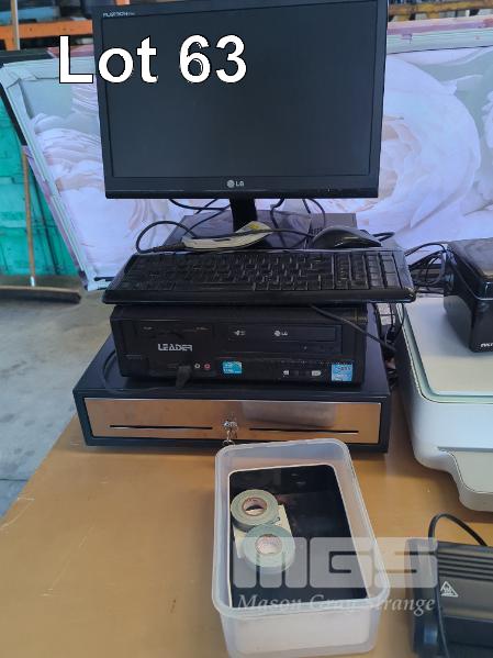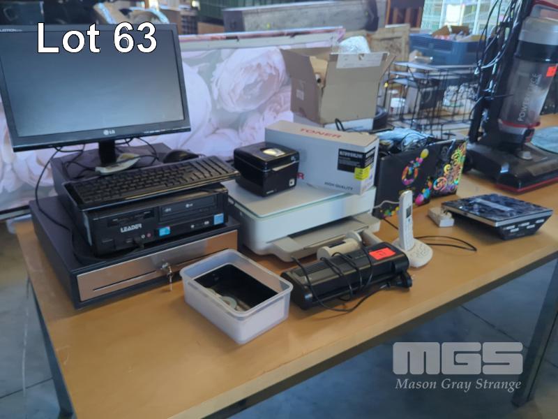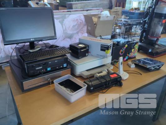 ASSORTED HAIR SALON ELECTRONICS. CASH DRAW, COMPUTER, MONITOR, DOCKET PRINTER, BARCODE SCANNER, PRINTER WITH TONER, LAMINATING MACHINE, CABLES TRANSFORMERS ETC.