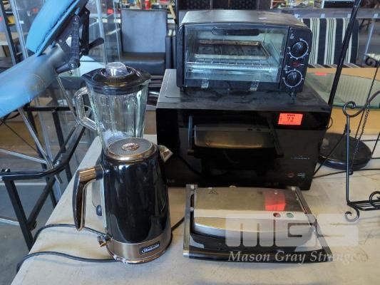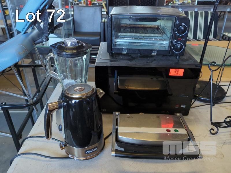 ASSORTED ELECTRICAL APPLIANCES. KETTLE, ICE CRUSHER, TOASTER OVEN, MICROWAVE OVEN AND SANDWICH PRESS.