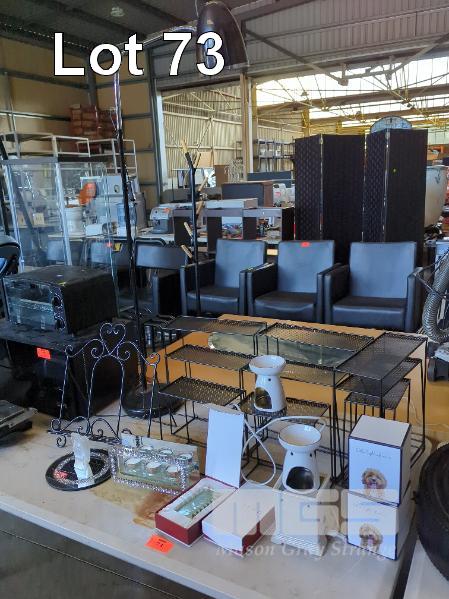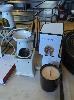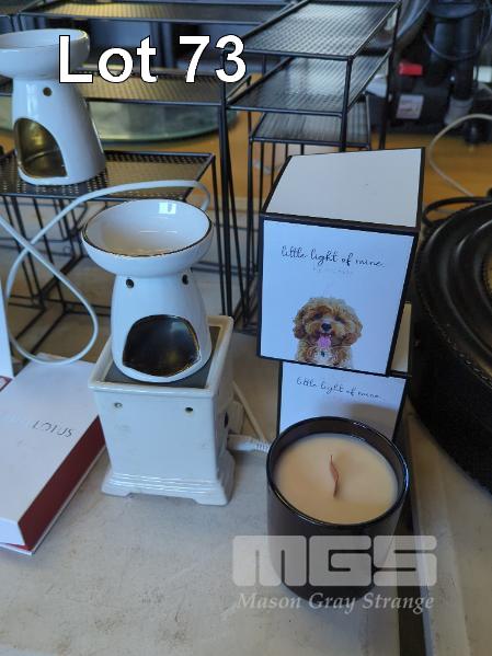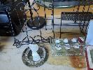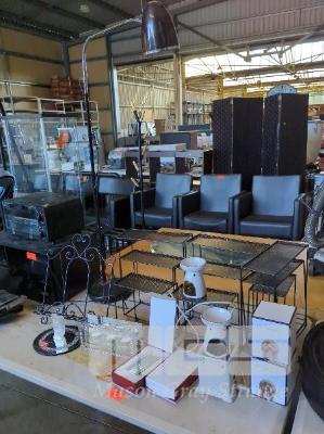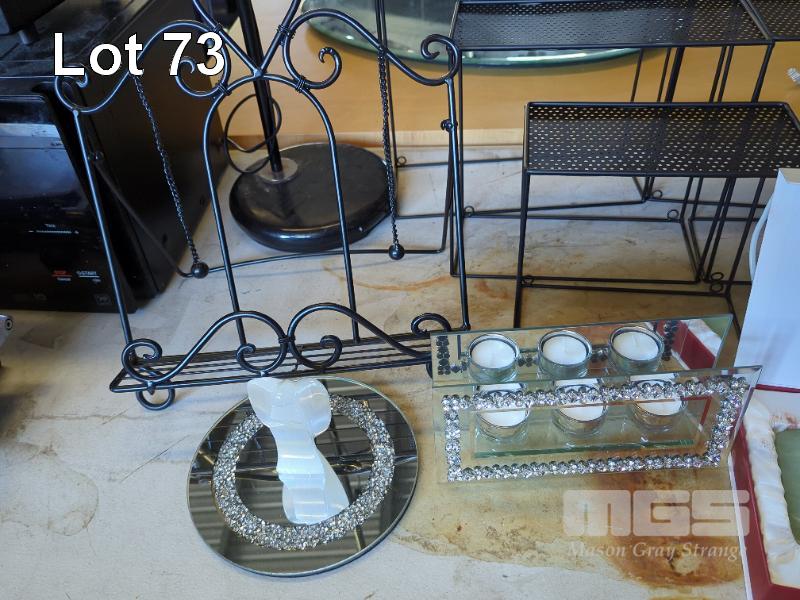 ASSORTED WIREFRAME DISPLAY STANDS, SCENTED CANDLES, WHITELOTUS SCALP COMBS, FLOOR LAMP, WROUGHT IRON LOOK DOCUMENT STAND AND ORNAMENTS ETC