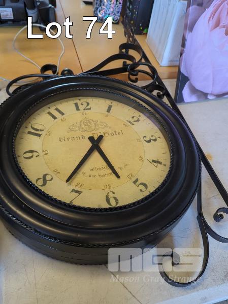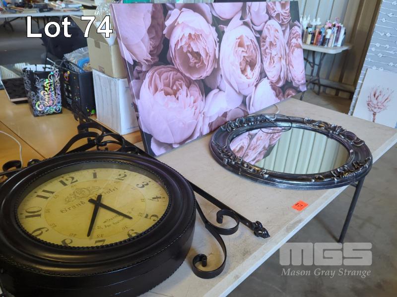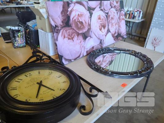 LARGE TRAIN STATION STYLE DOUBLE-SIDED HANGING CLOCK, STRETCHED CANVAS PRINT - ROSES AND MIRROR ** MIRROR LOOSE IN FRAME AND LATCHES BROKEN ON CLOCK **