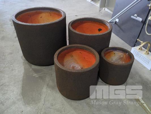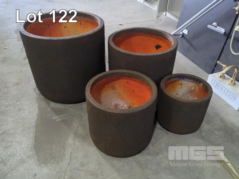 SET OF 4 X CONTEMPORARY PLANTER POTS. COLOUR CORTEN. NEW, NESTED PACKED. 1 @ 50 CM DIAMETER X 47 CM HEIGHT. 1 @ 42 CM DIAMETER X 40 CM HEIGHT. 1 @ 34 CM DIAMETER X 32 CM HEIGHT. 1 @ 27 CM DIAMETER X 25 CM HEIGHT.