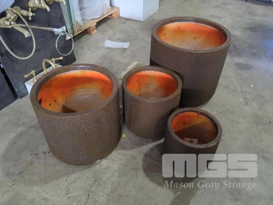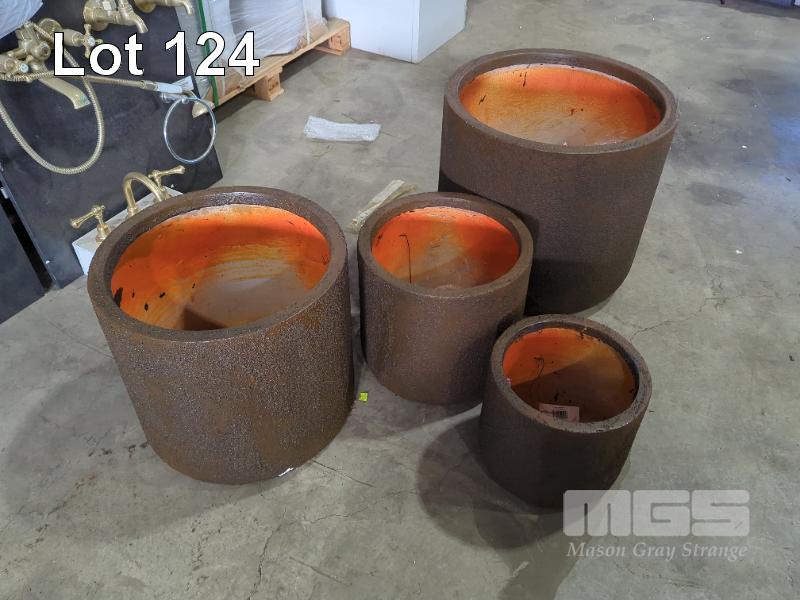 SET OF 4 X CONTEMPORARY PLANTER POTS. COLOUR CORTEN. NEW, NESTED PACKED. 1 @ 50 CM DIAMETER X 47 CM HEIGHT. 1 @ 42 CM DIAMETER X 40 CM HEIGHT. 1 @ 34 CM DIAMETER X 32 CM HEIGHT. 1 @ 27 CM DIAMETER X 25 CM HEIGHT.