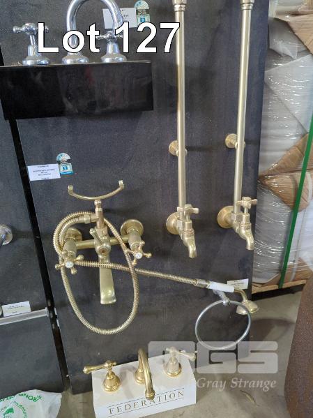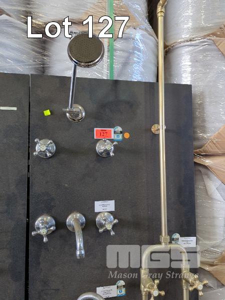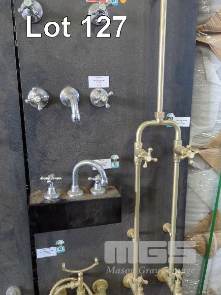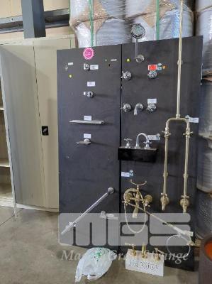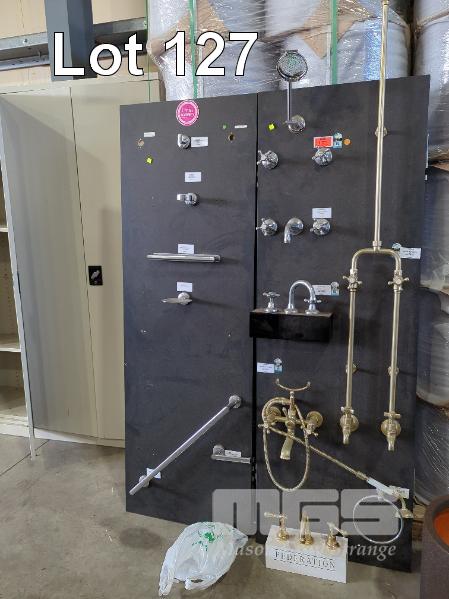 2 X RETAIL BATHROOM DISPLAY PANELS AND CONTENTS OF TAPWARE, MIXERS, SOAP TRAYS, TOWEL RAILS ETC.