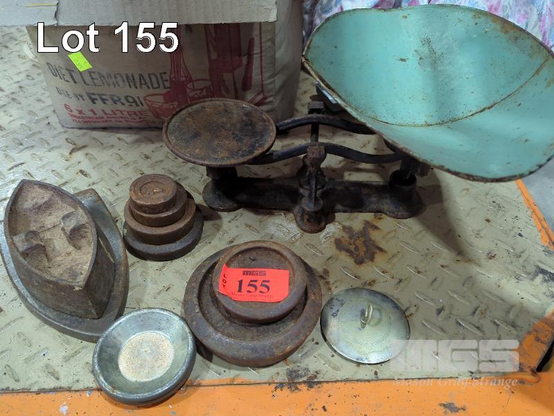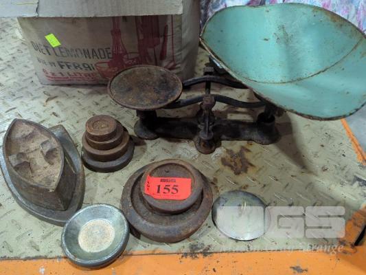 VINTAGE BALANCE SCALES, WEIGHTS. IRON WITH STAND