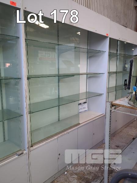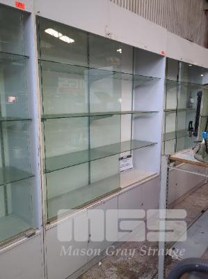 LARGE ILLUMINATED DISPLAY UNIT WITH 2-SLIDING GLASS DOORS, 3-GLASS SHELVES AND 4-DOOR UNDER STORAGE IN GREY (181 X 45 X 240 CM W D H) ** LOCKABLE, NO KEYS ** ** LOCATED IN MAIN SHED **
