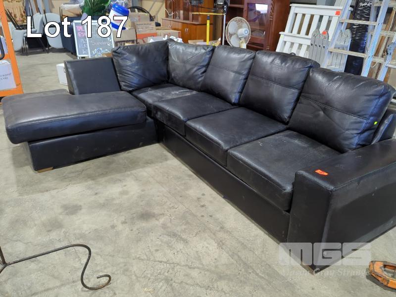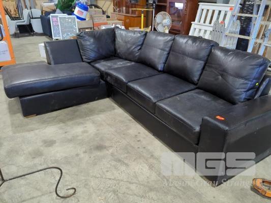 5-SEATER CORNER CHAISE LOUNGE/SOFA BED IN BLACK, LHS CHAISE. ** CUSHON MISSING ** ** SOFA BED MECHANISM DAMAGED **