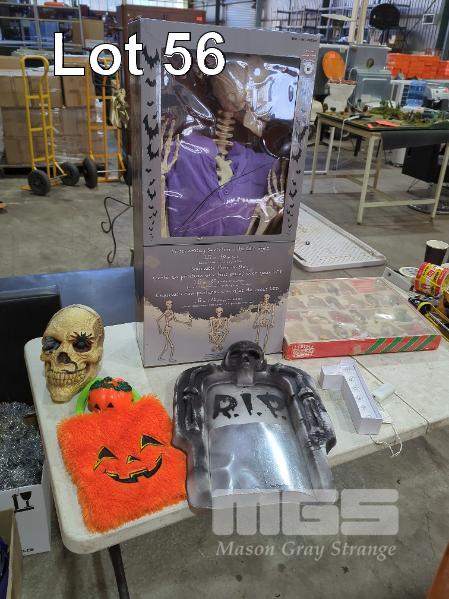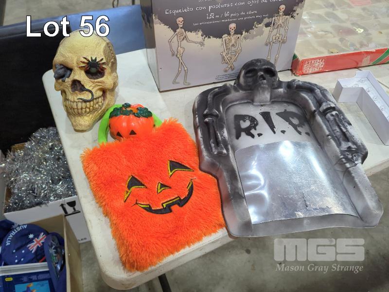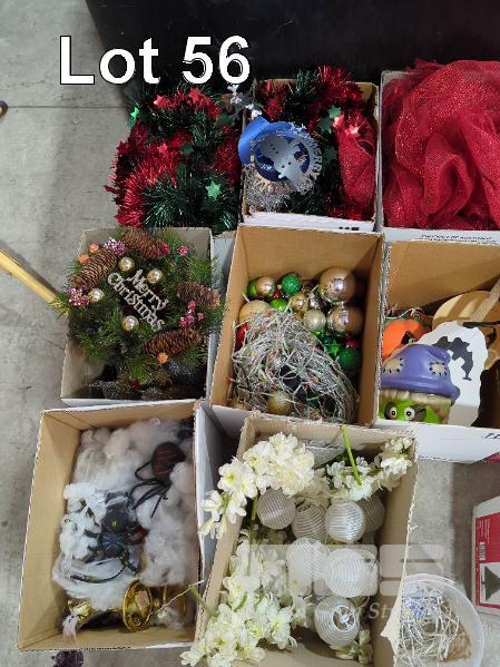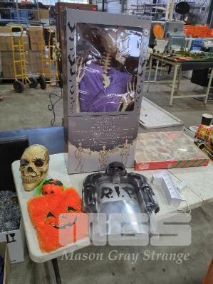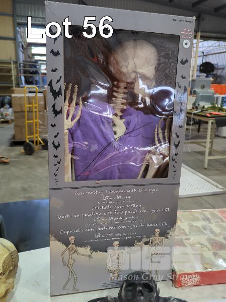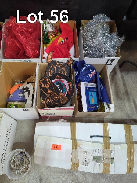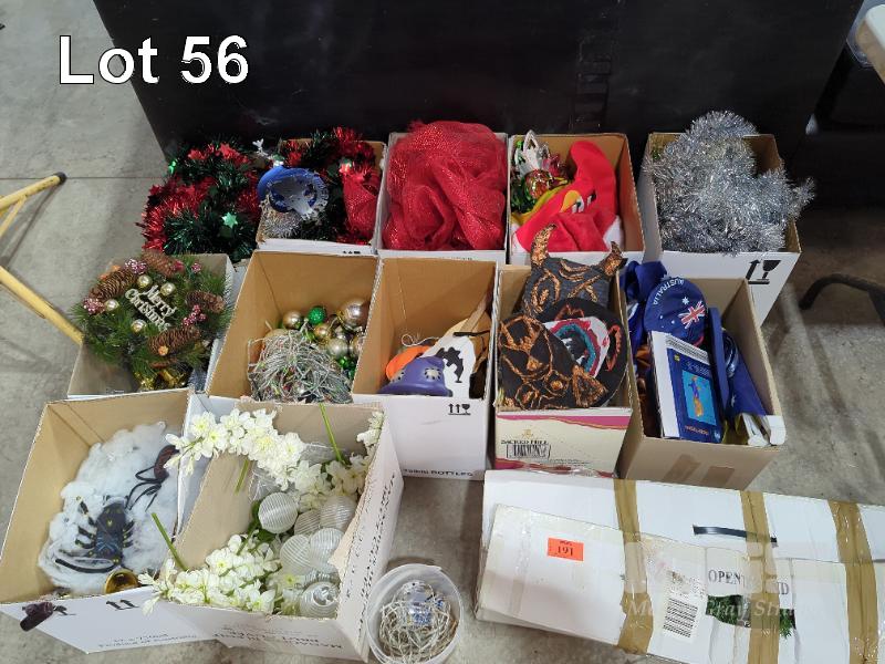 COLLECTION OF DECORATIONS FOR XMAS, HALLOWEEN, AUSTRALIA DAY AND WEDDINGS. INCLUDES XMAS TREE, LED POSE-N-STAY SKELETON AND GLOW IN THE DARK SKULL. 12 X BOXES.
