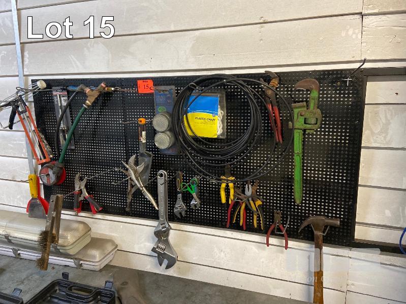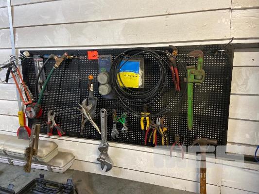SHADOW BOARD & CONTENTS SHIFTERS, PLIERS, VICE GRIPS, PIPE WRENCH, STEEL RULER & 2 x FLURO LIGHTS