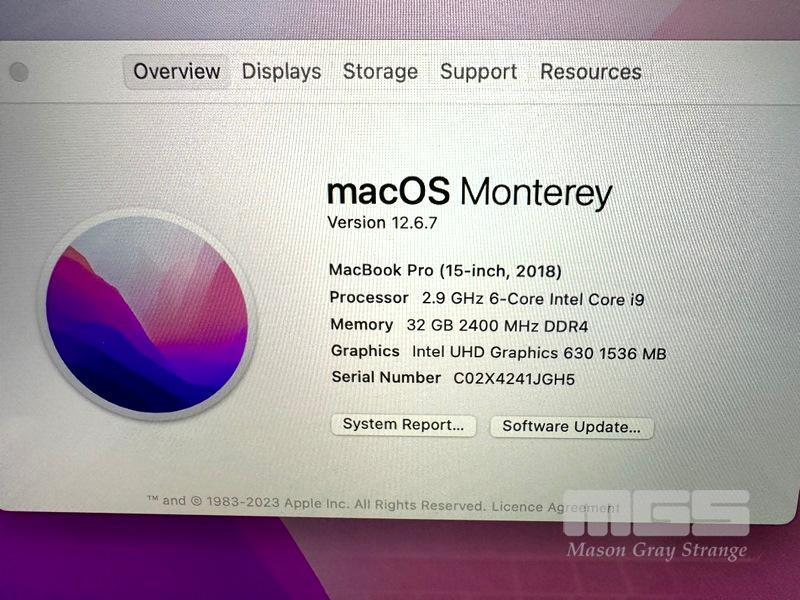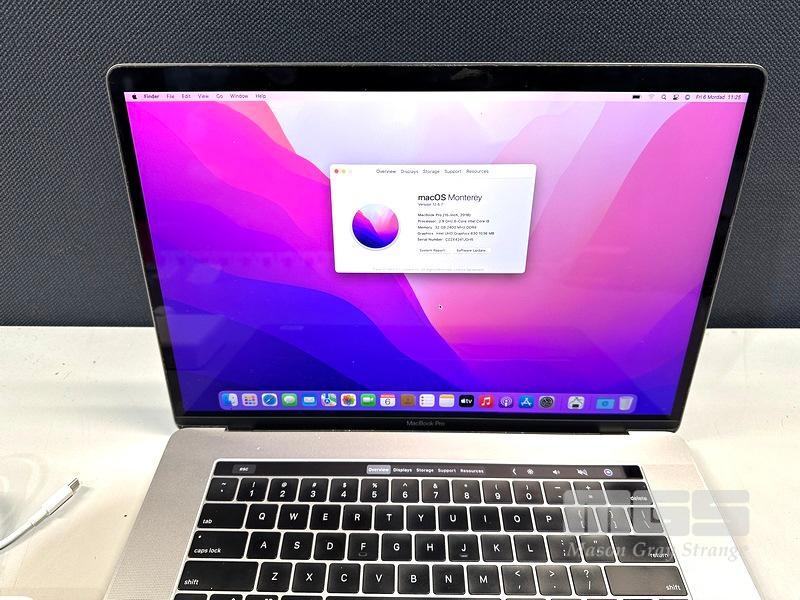 LAPTOP, APPLE MACBOOK PRO (A1990), CORE i9 8950HK (8TH GEN) @ 2.9GHz, 32GB DDR4 RAM, 256GB SSD, 15.4" RETINA DISPLAY (2880x1800), INTEL UHD GRAPHICS 630, THUNDERBOLT 3, TOUCHBAR, Wi-Fi, BLUETOOTH, MAC OS 12 INSTALLED & USB-C POWER SUPPLY (NOTE: MINOR MARKS ON SCREEN) S/N:C02X4241JGH5
