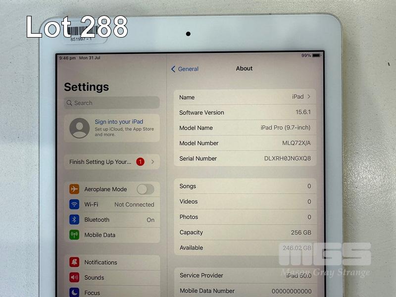 APPLE iPAD PRO 9.7", 256GB, Wi-Fi, CELLULAR, SILVER, MLQ72X/A (NO CABLE, NO CHARGER) (NOTE: SMALL SCRATCH ON SCREEN) S/N:DLXRH0JNGXQ8