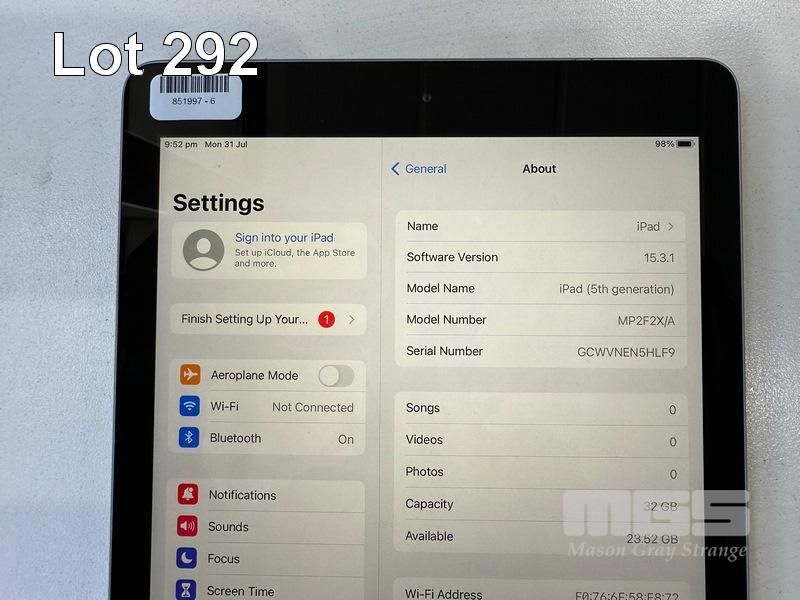 APPLE iPAD (5TH GEN), 32GB, Wi-Fi, SPACE GREY, MODEL A1822, MP2F2X/A (NO CABLE, NO CHARGER) S/N:GCWVNEN5HLF9