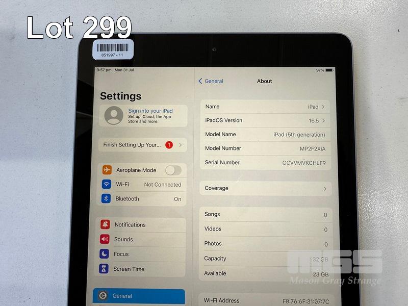 APPLE iPAD (5TH GEN), 32GB, Wi-Fi, SPACE GREY, MODEL A1822, MP2F2X/A (NO CABLE, NO CHARGER) S/N:GCVVMVKCHLF9
