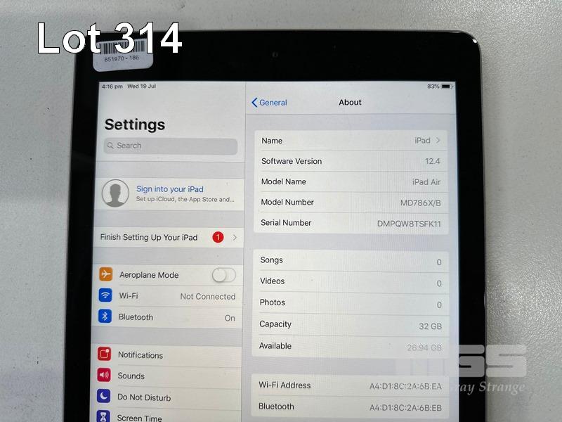 APPLE iPAD AIR, 32GB, Wi-Fi, SPACE GREY, MODEL A1474, MD786X/B (NO CABLE, NO CHARGER) S/N:DMPQW8TSFK11