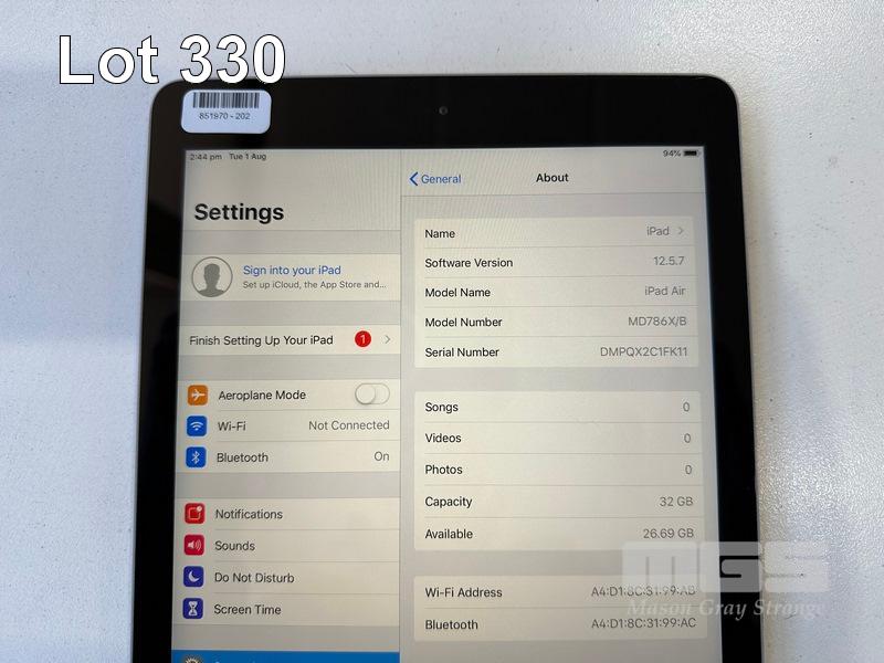 APPLE iPAD AIR, 32GB, Wi-Fi, SPACE GREY, MODEL A1474, MD786X/B (NO CABLE, NO CHARGER) S/N:DMPQX2C1FK11