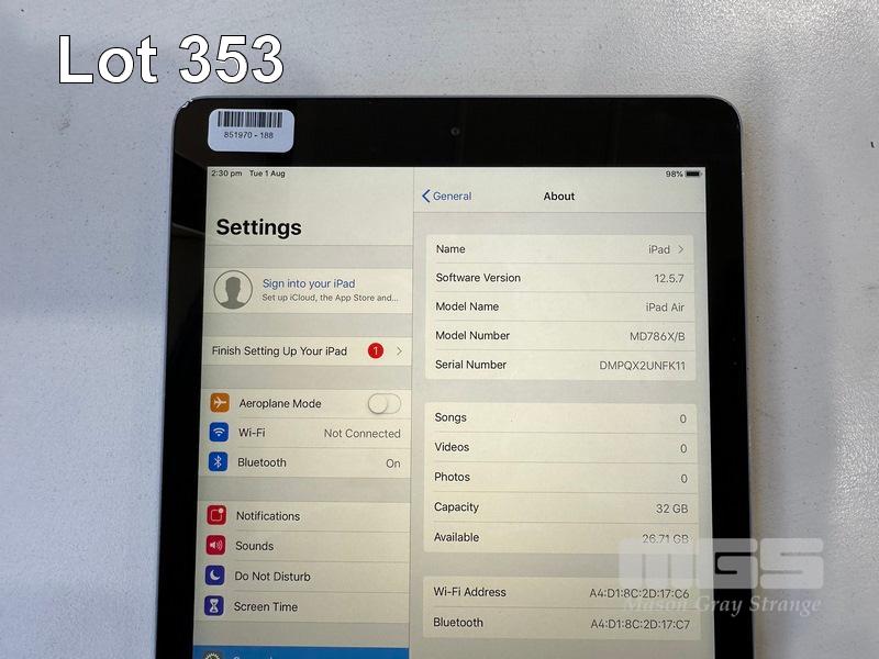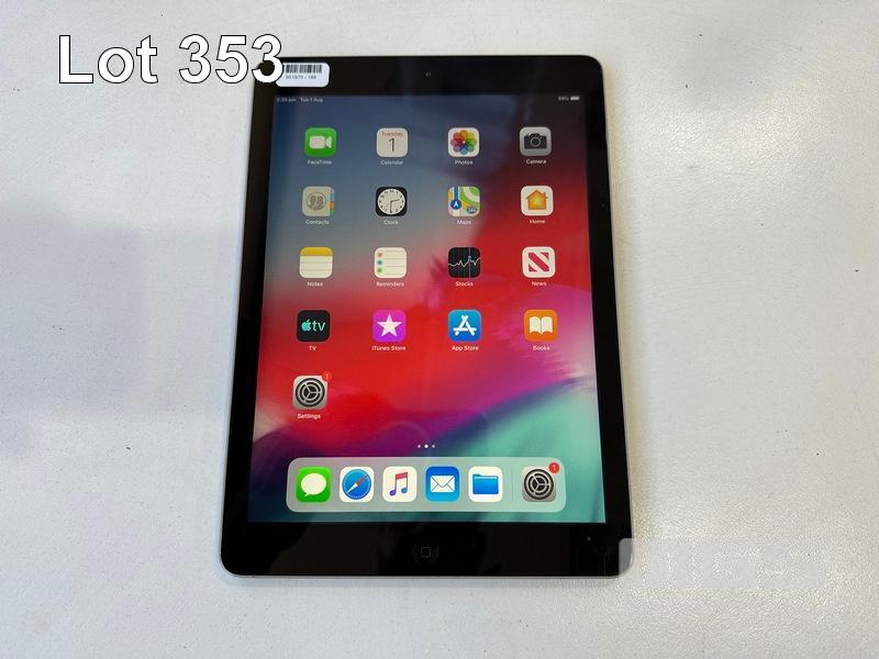 APPLE iPAD AIR, 32GB, Wi-Fi, SPACE GREY, MODEL A1474, MD786X/B (NO CABLE, NO CHARGER) (NOTE: MINOR DAMAGE TO CORNER OF CASING) S/N:DMPQX2UNFK11