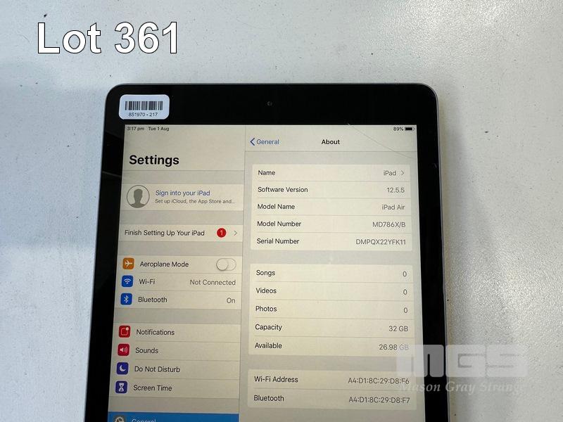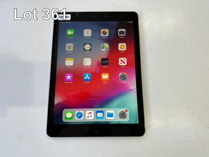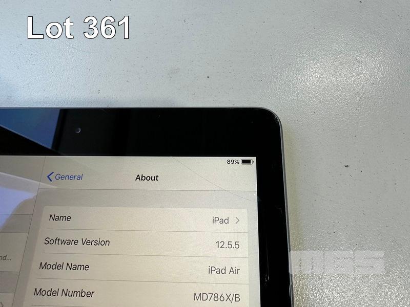 APPLE iPAD AIR, 32GB, Wi-Fi, SPACE GREY, MODEL A1474, MD786X/B (NO CABLE, NO CHARGER) (NOTE: CRACK LINES ON SCREEN) S/N:DMPQX22YFK11