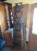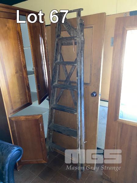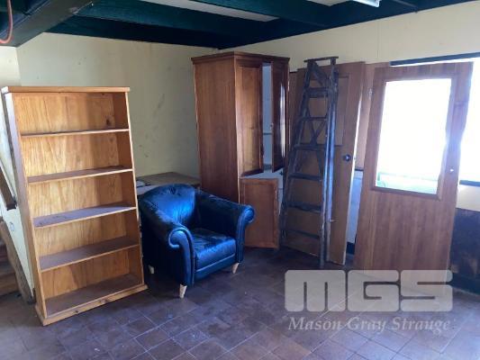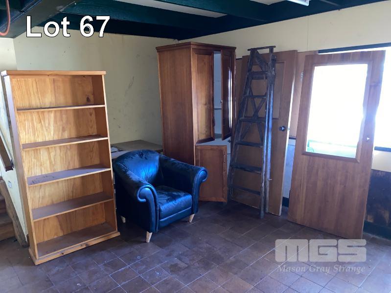 TIMBER BOOKSHELF, 4 DOOR TIMBER CABINET, SINGLE SEAT LEATHER SOFA, 2 x SOLID TIMBER DOORS, GLAZED, 795 x 1955mm & 800 x 2035mm, ANTIQUE LADDER (DISPLAY ONLY)