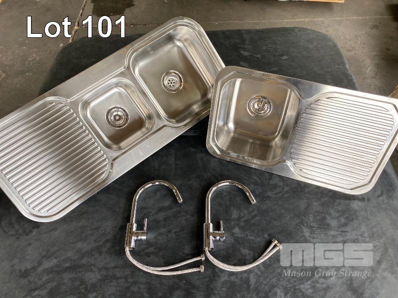 TWIN BOWL STAINLESS STEEL SINK, 1200 x 500mm & SINGLE BOWL STAINLESS STEEL SINK, 775 x 480mm WITH 2 x WATERMARK SINGLE LEVER SINK MIXERS WITH FITTINGS, NEW!