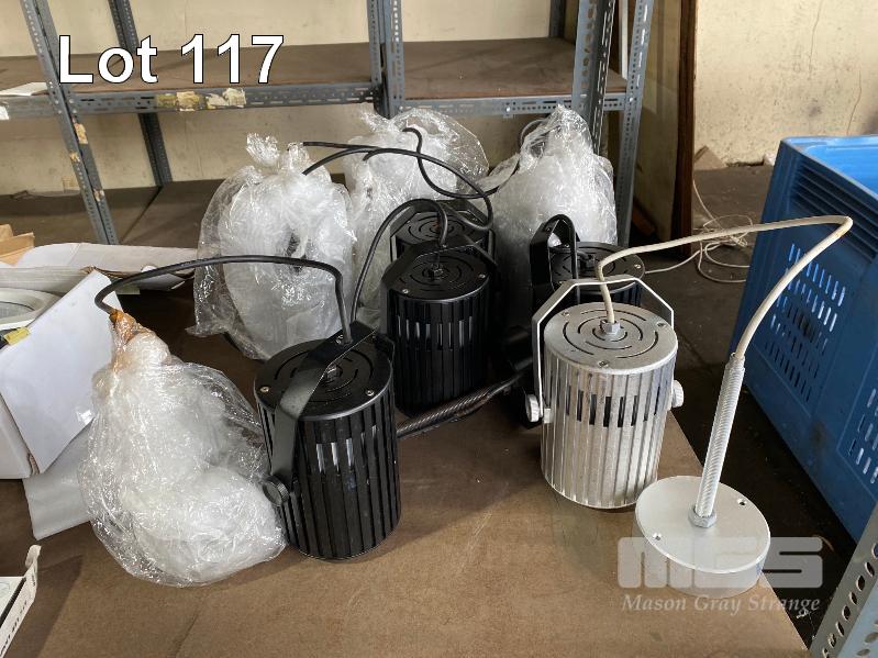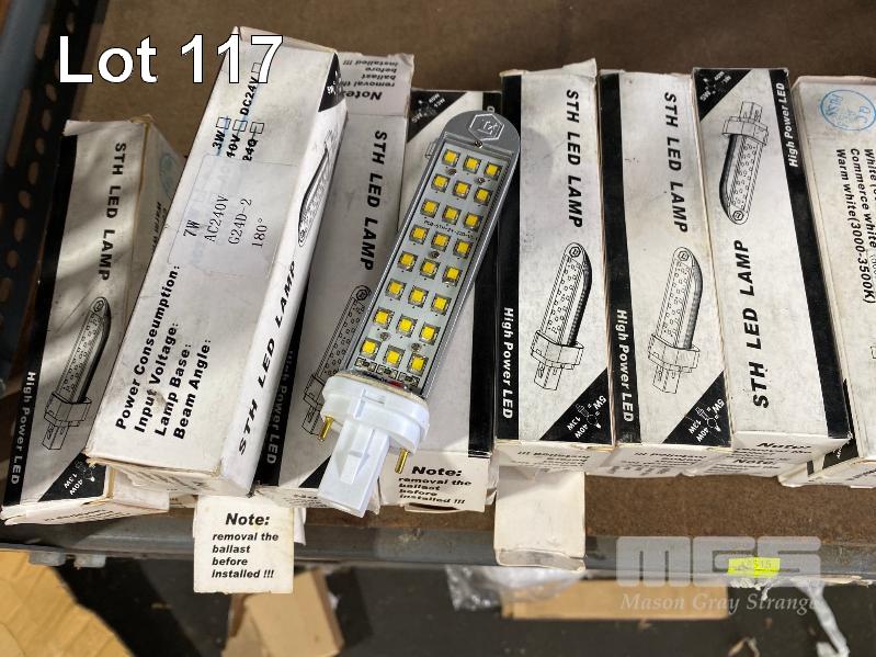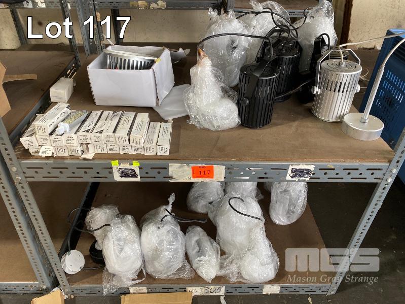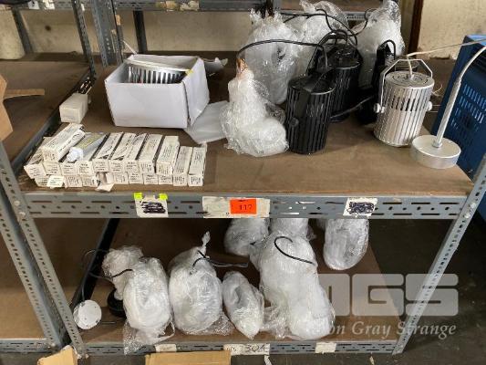 CONTENTS OF 2 SHELVES, LED REPLACEMENT GLOBES, LED PENDANT LIGHTS, LARGE LED DOWN LIGHT, ETC.