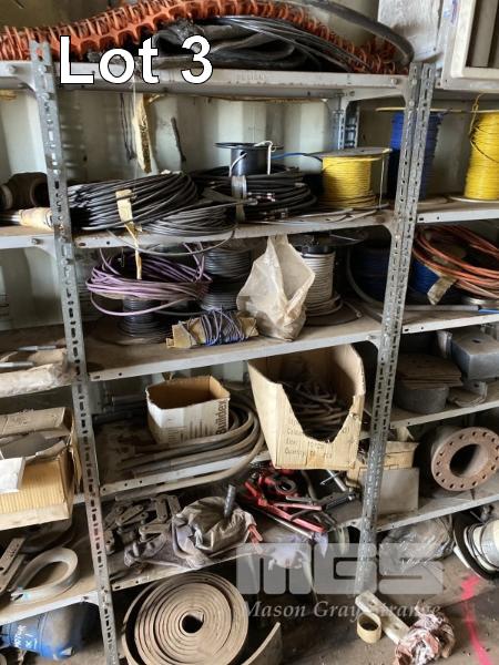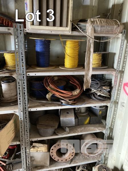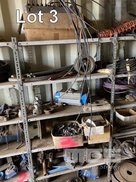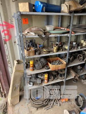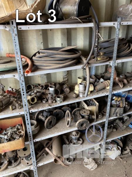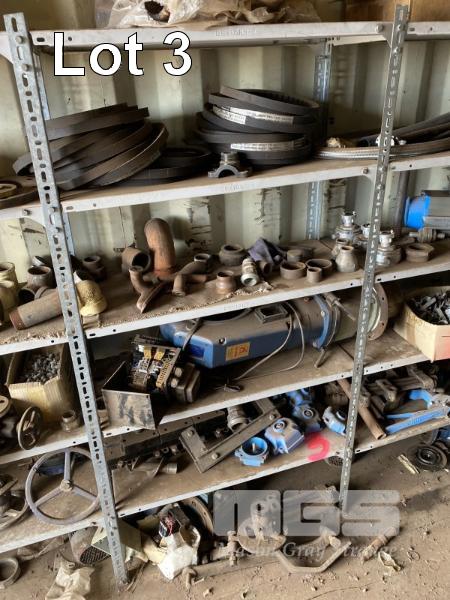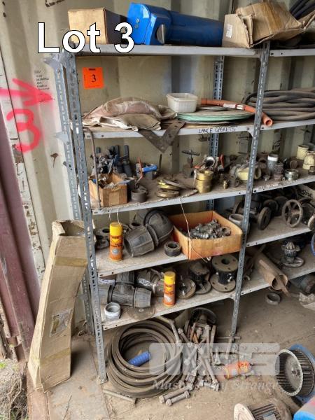 CONTENTS OF 6 BAYS SHELVING, VALUES, PIPES FITTINGS, GASKETS, AIR FITTINGS, ELECTRICAL CABLE, HARDWARE INCLUDING, GALV NUTS & BOLTS, STEEL ELBOWS, V BELTS & MORE!