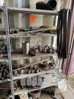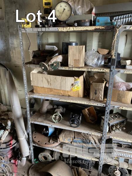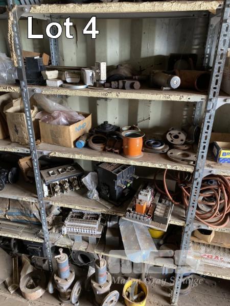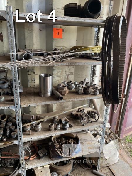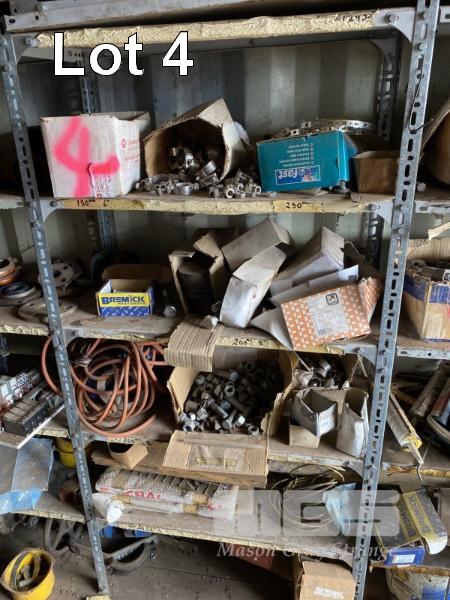 CONTENTS OF 5 BAYS SHELVING, GALV PIPE FITTINGS, PIPE CLAMPS, VALVES, V BELTS, HARDWARE INCLUDING NUTS & BOLTS ETC. GREASE GUNS, PYROMETER SENSORS & MORE!